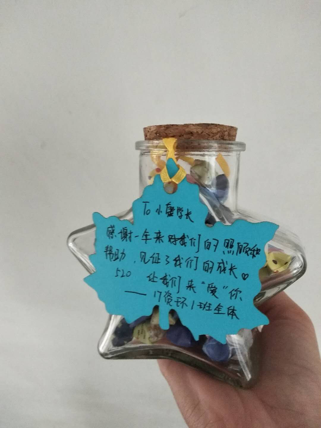 班助是同学们大学路的导航者,是生活中的大哥哥、大姐姐,他们耐心回答同学们的问题,督促同学们学习,每天早起检查早读,为同学们找各种复习资料,给予同学们鼓励和帮助。同学们将感谢之情写在了纸上,折成星星亲手送给班助。