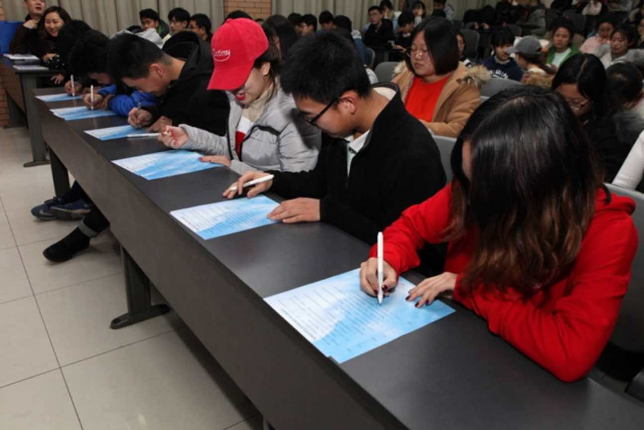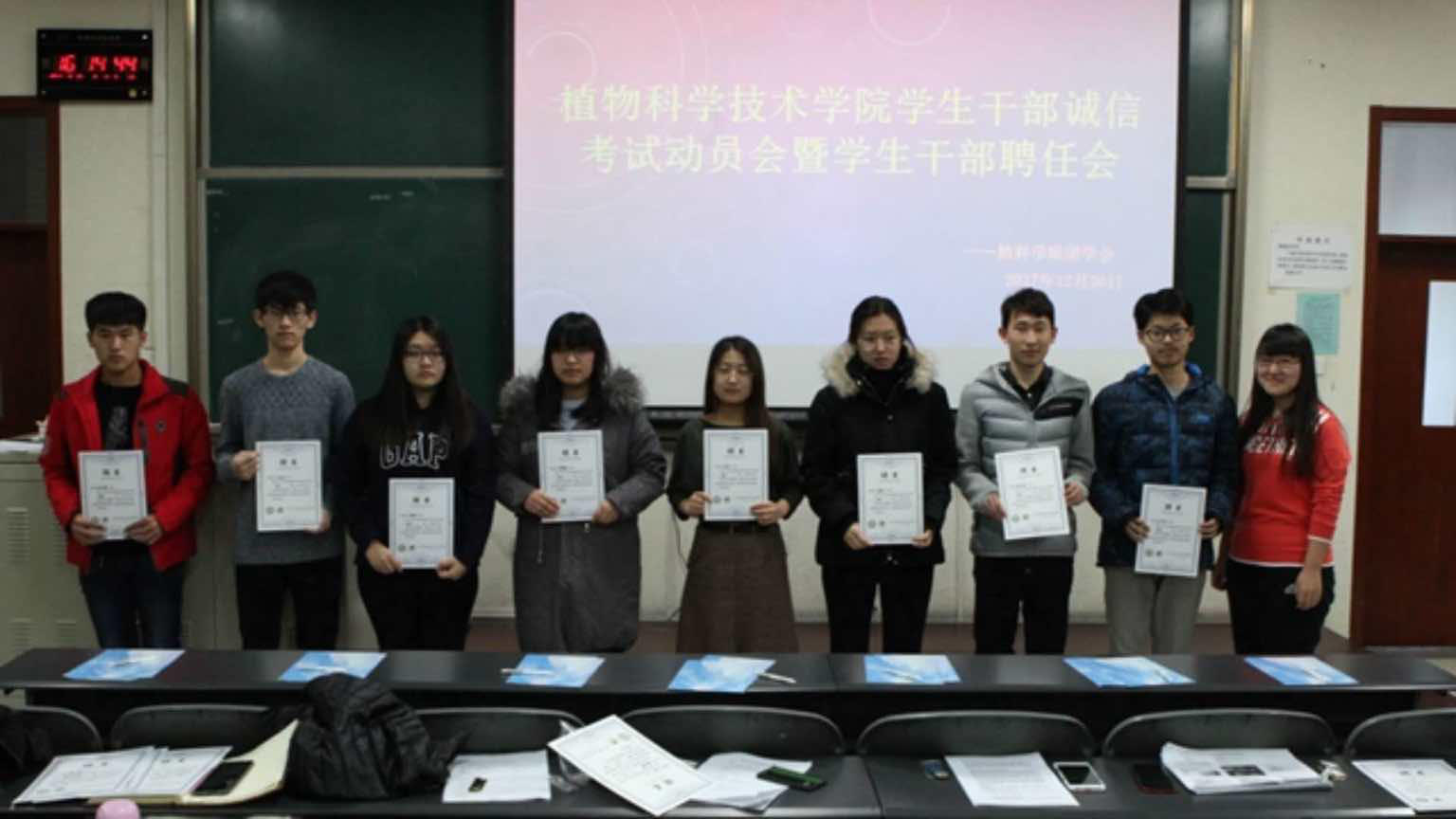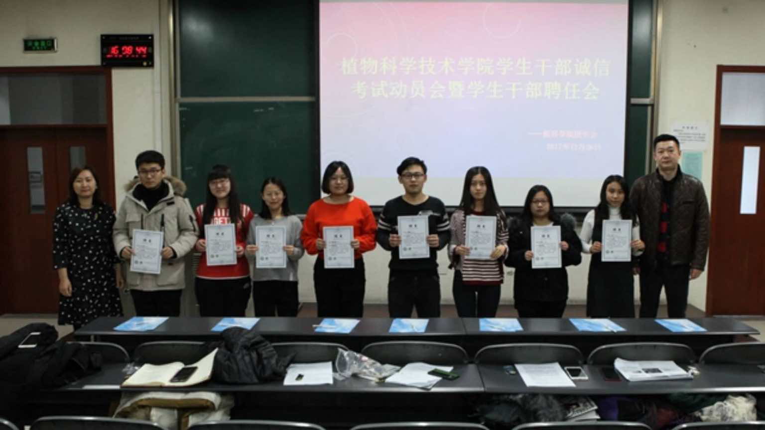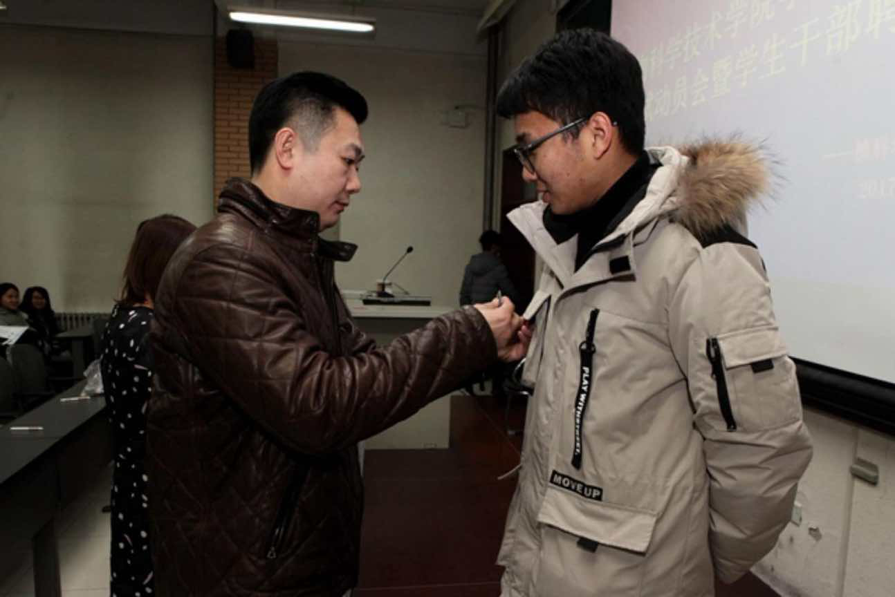 会议伊始,牛老师和郝老师为员工会主席团成员颁发员工干部徽章及聘书、两位老师及主席团成员为副部长及以上成员颁发聘书、并由员工会主席团成员为各班班长及班级代表、宿舍长及宿舍长代表颁发聘书。然后16级、17级班长上前签署了诚信考试承诺书,表达同学们诚信考试、积极备考的决心。