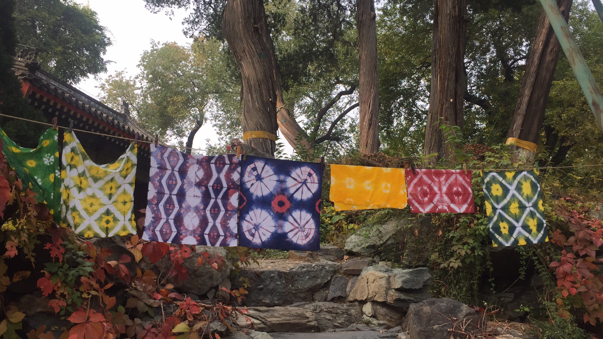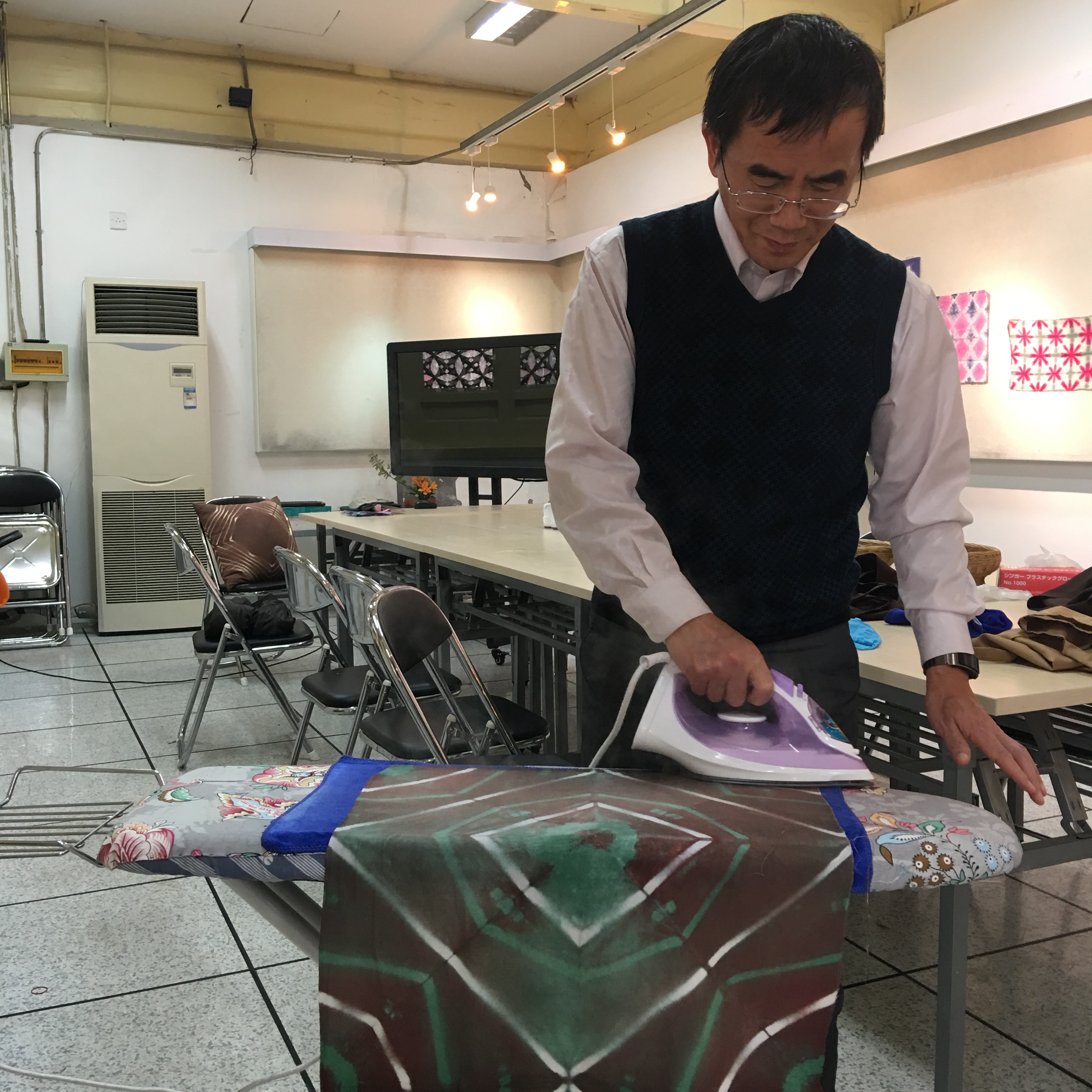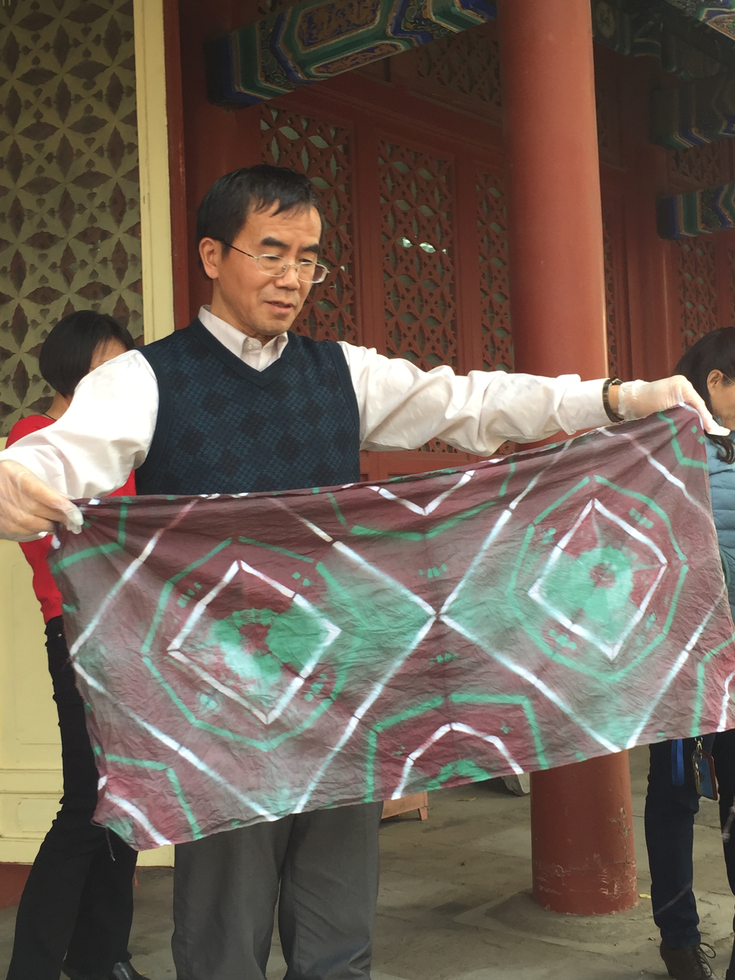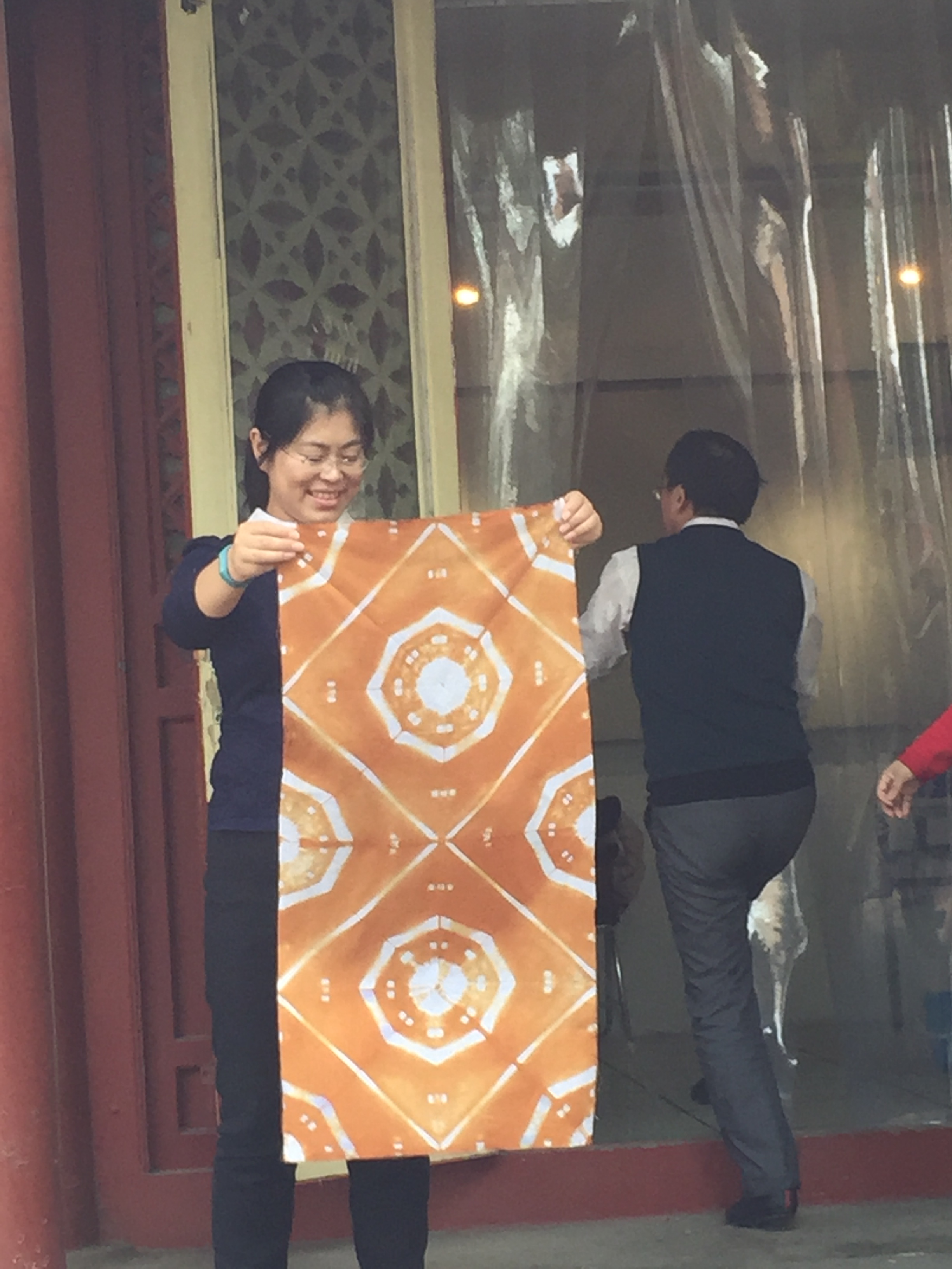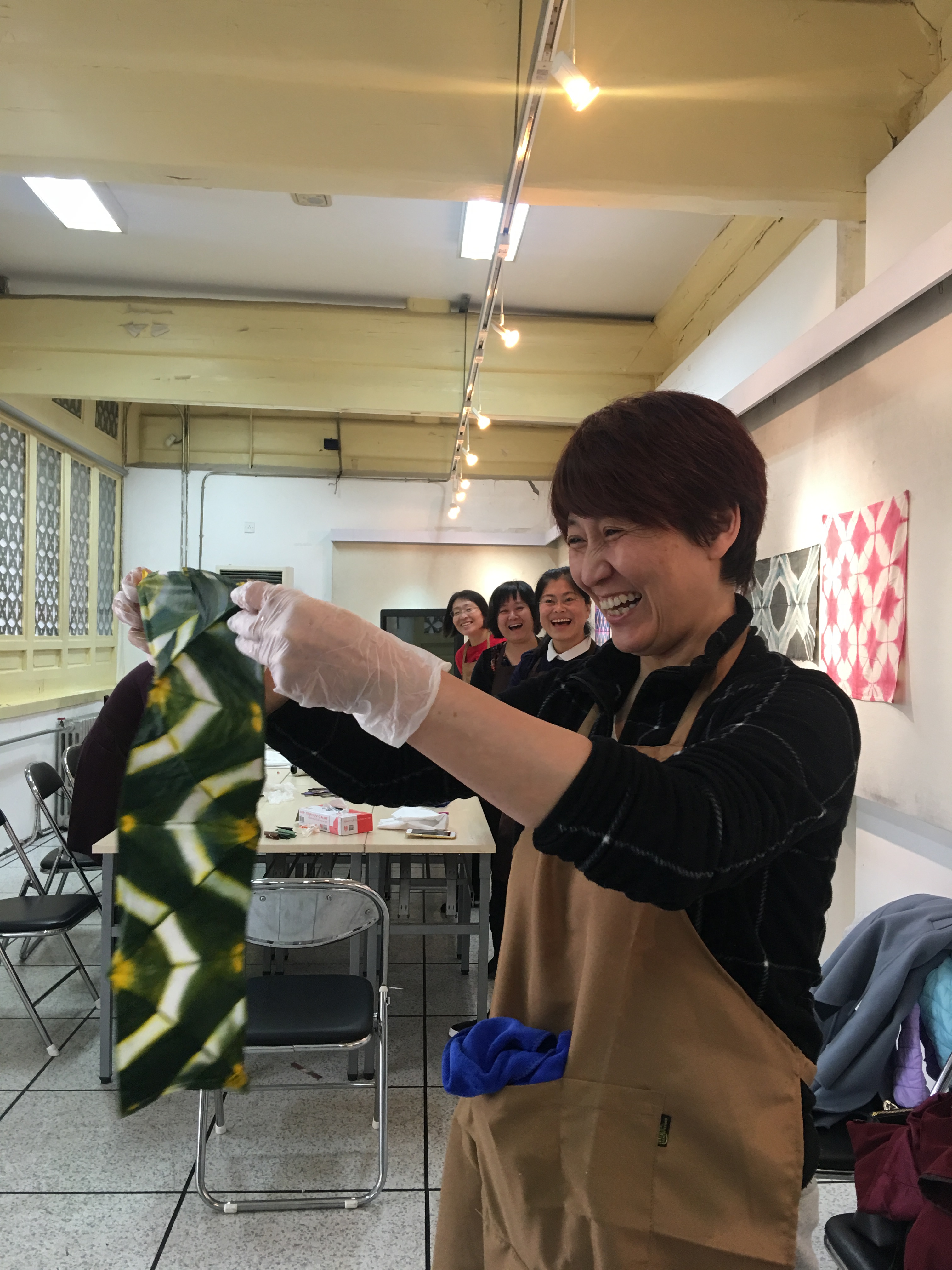 每个人的心里都没有底,手里拿着白布,摆弄来摆弄去,犹犹豫豫,不知怎么叠才好;桌上的工具也是选来选去,换来换去;心里还琢磨着到底染成什么颜色呢?是用三种颜色还是两种颜色染?最后干脆不管三七二十一,漫无目的、糊里糊涂地把白布叠成了自己都不能再次重复过程的半成品,放到了自己选择的染料缸里。经过染色、冲洗、再染色、再冲洗、固定、冲洗……几个步骤操作过后,终于到了拆掉工具、打开棉布,一展它真容的时候了。这是最激动人心的时刻,大家的目光不约而同地聚集在第一个正在打开的作品上,迫不及待而又满心激动地小心翼翼一点一点打开湿漉漉的染布的那一刻,所有人的目光都集中到这个作品上,紧紧盯着它,看着它一点点被揭开神秘的面纱。那个过程令人屏息、令人兴奋、令人欣喜,至今仍令人回味无穷……,那种感觉真是妙不可言!让我们吃惊的是我们每个人都是那么成功,我们的每个作品都是那么漂亮,而且独一无二。