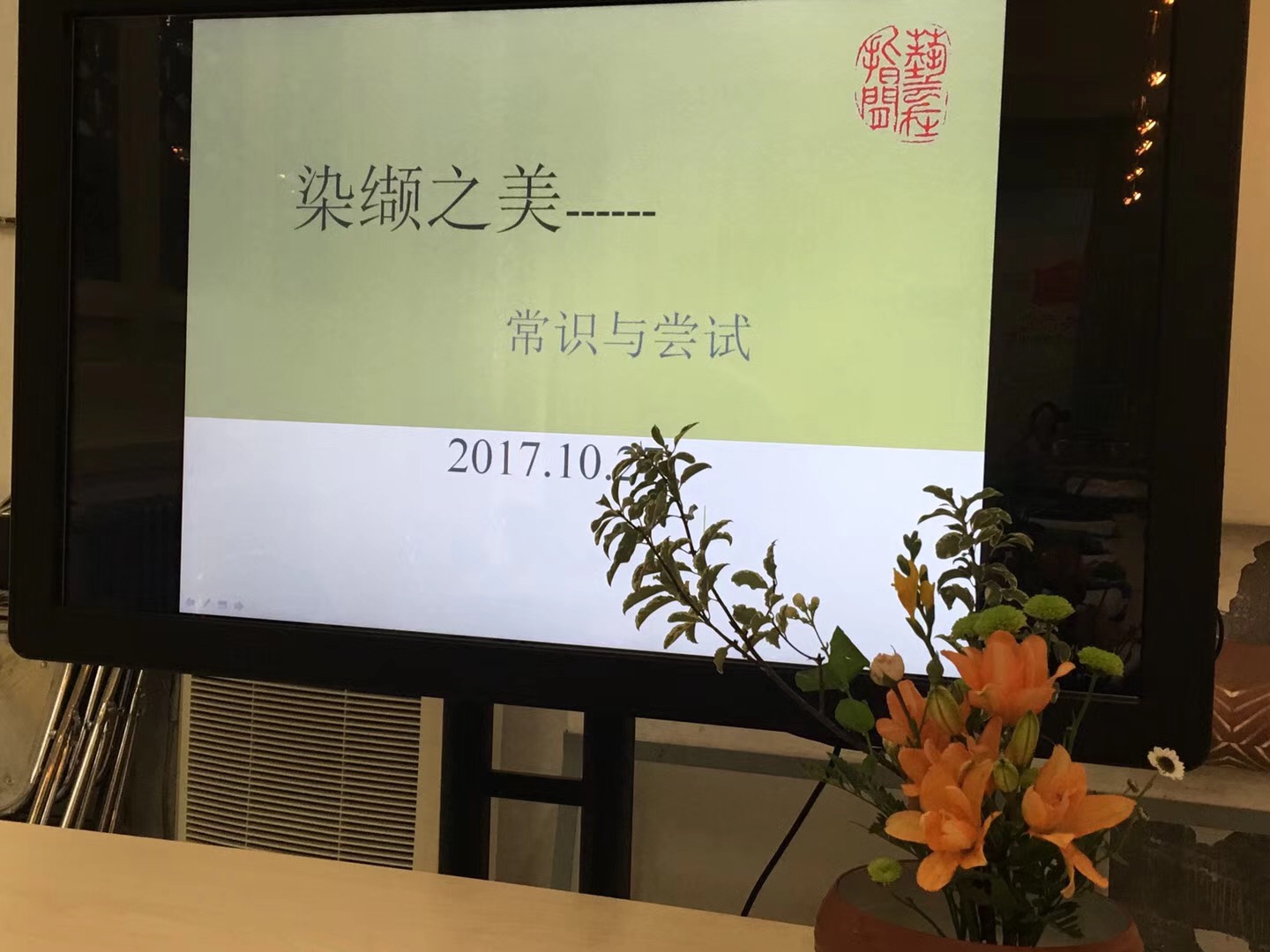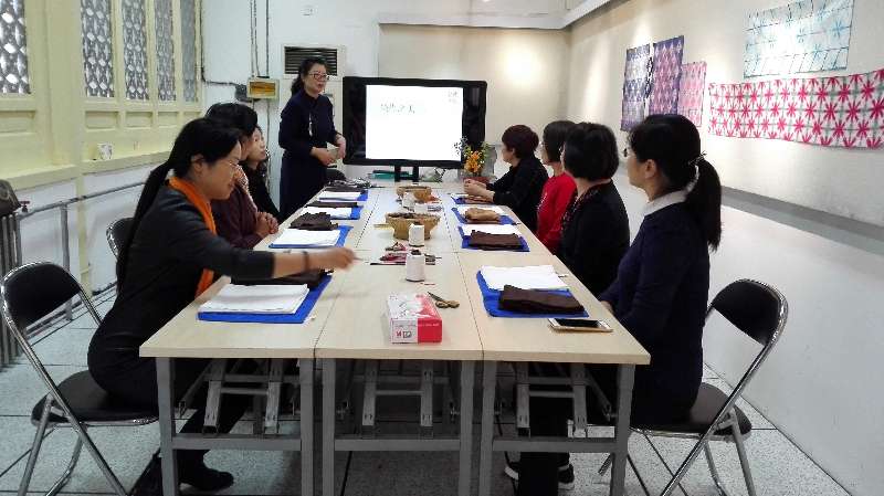 2017年10月27日上午,太阳集团tyc33455分工会组织老师们去了北京艺术博物馆学习、体验扎染艺术。上午9点我们到了座落在万寿寺的北京艺术博物馆,博物馆的金老师领我们走进了扎染教室。房间的墙上挂着几幅扎染作品,大桌上摆满扎染工具,小桌上摆着电磁炉和几盆染液。博物馆的王馆长早就做好了一切准备,等候着我们的到来。她先给我们讲解扎染的类型种类、基本制作方法,然后给我们每个人发了一块白色的方形棉布和一块长方形棉布,开始制作方巾与靠背垫。大家立刻穿上围裙,心里无比激动和忐忑。激动的是马上就要亲手独立制作出扎染作品;忐忑的是不知道如何下手才好,担心自己做出很难看的东西。