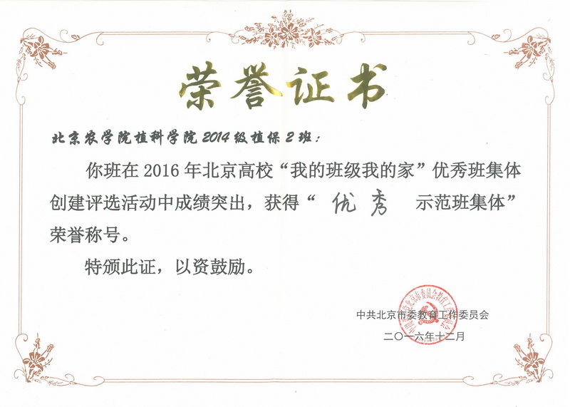 经过现场展示答辩,2014级植保2班获北京高校“优秀示范班集体”荣誉称号。