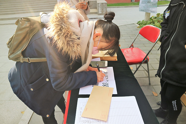 在活动中,同学们无视瑟瑟秋风,拿起桌上准备好的笔和纸,认真写下对家人、亲戚、朋友或老师最真诚的话语。书信,一种最古老的通信方式,却传达了笔者最真挚的感情。一笔一划,描绘出心中感激;字里行间,表达出万千思念。在现在一个矛盾的年代,最应亲近的心灵日趋封闭。一条小小的书信,却表达了员工的感恩之情。