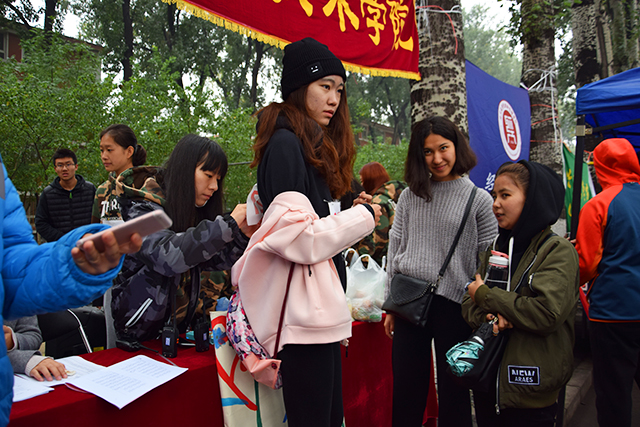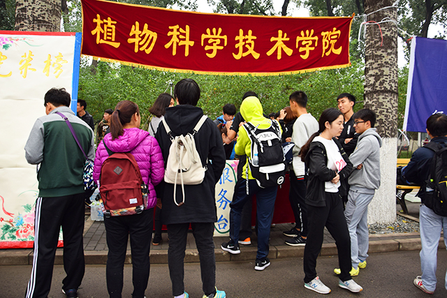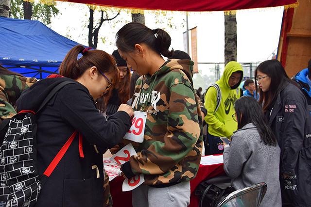桌子上面摆设:号码牌、急用的医药箱以及必备的饮用水。太阳集团tyc33455院旗在风中飘扬,而一个个带着袖标的志愿者,让人在远处也很容易找到,这就是植科服务站。