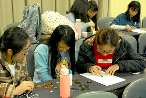 蝶翅画制作开场由15级的张璇,许佟为新生们系统介绍了蝶翅画的来历,制作方法与技巧。同学们沉醉其中,用心制作出了精美的艺术品:北农美景、北农校徽、北农特色,同学们的作品表达出他们对校园深深的热爱。