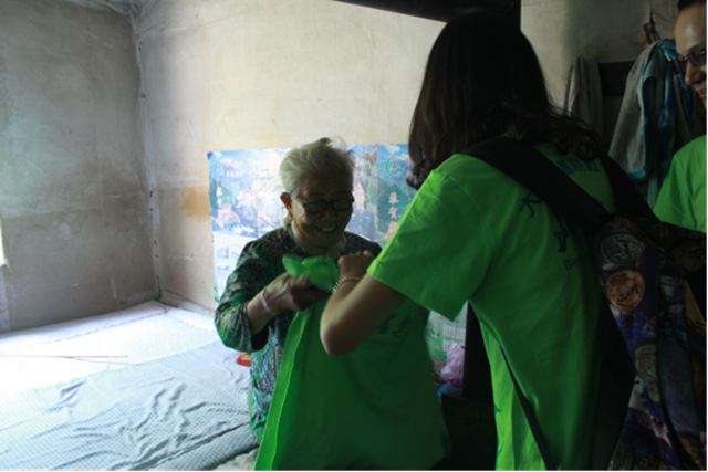 爷爷去世后,村里为奶奶办了低保,但是每月的低保补贴根本无法保证奶奶最基本的吃穿,于是她便自己动手编一些小篮子拿到村里的集市上去卖,当我们走进奶奶堆放编织材料的小屋子里时,大家的眼眶都禁不住泛起了泪花,奶奶的手因为编织时经常被绳子勒着,以致于出现了许多深浅不一的伤口。奶奶自己居住的小屋每次下大雨时都会漏水,自己又无能力改造,奶奶哭着对我们说:“没想到你们这群老员工还能来看我,我没有别的需求,只希望村里能把我这房子给修了。”