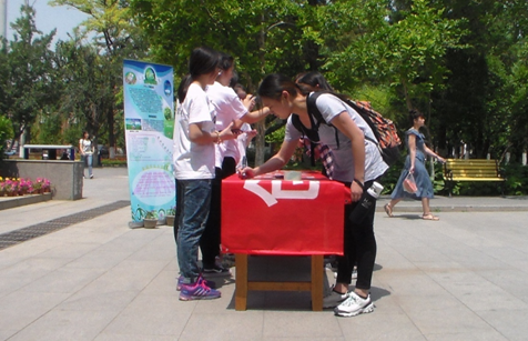 6月1日上午10点,农业资源与环境系本科生党支部成员全体身着宣传服在礼堂东门前集合,布置活动现场,挂起宣传海报和横幅。宣传活动开始,支部成员以宣传小组形式,向师生进行关于世界环境日和环境保护工作的宣传和讲解,介绍校园环保小常识,并号召师生在宣传横幅上写出自己关于环境保护的建议和想法,进行“环保从我做起”的签名征集。同时,党支部联系校团委,在礼堂广场大屏幕上连续播放了3天环保宣传片,播放时间为每天中午11:30-13:00,正值中午就餐时间,广场上人流量较大,起到了很好的“环境保护、从我做起”的宣传效果。