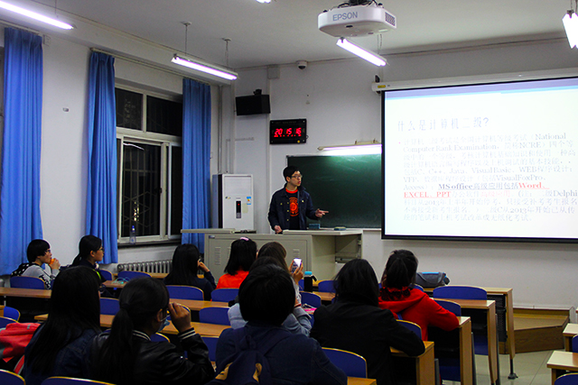 2016年4月7日星期四,太阳集团tyc33455在教学楼A座106教室举办了计算机二级资格证书培训交流的员工沙龙活动,主讲人是2013种子班的林靖晨和张凌霄,他们已顺利通过了计算机二级考试。