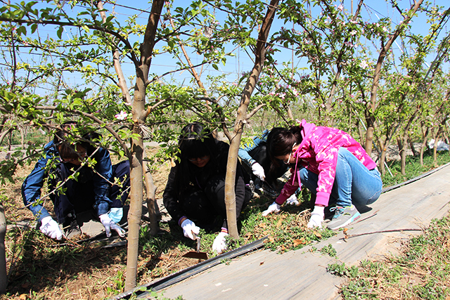 清晨,党支部成员在校门口集合,乘坐公交前往基地。到达目的地后,管理果园的薛师傅为党员们派发除草工具,并指导大家掌握除草要领。在老师的指导下,党员们对果园里积累的杂草进行了清理。