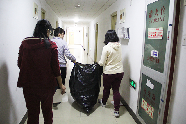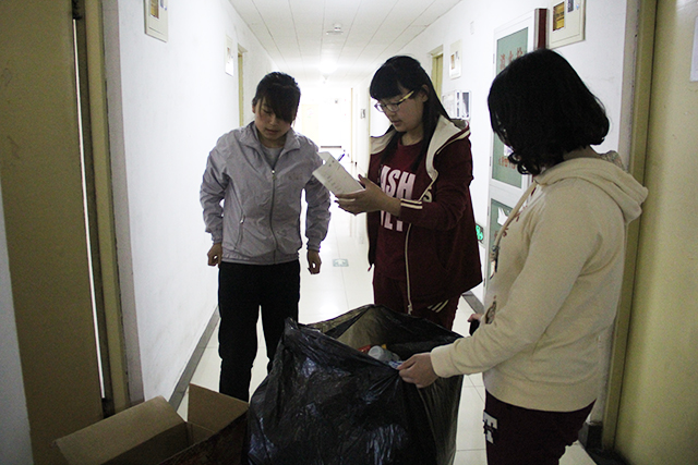 首先,自助社负责人分配任务,随后,志愿者们拿上垃圾袋前往各个宿舍开始回收塑料瓶。志愿者们两人一组按着分配到的宿舍号回收废旧塑料瓶。志愿者们忙碌的身影在走廊楼道间穿梭,他们在用自己的实际行动践行环保的生活理念。最后,在志愿者们的辛勤工作与同学们的积极配合下,收获了满满四袋塑料瓶。