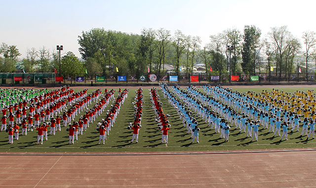 伴着充满律动感的节拍,迎来了万众瞩目的千人啦啦操表演。在持续一个月的辛苦训练后,她们着装整齐,精神饱满,彰显出青春的热情,激情四射而又不失典雅。她们不畏炎热,为绿色的希望而舞,在骄阳下绽放她们青春的美。