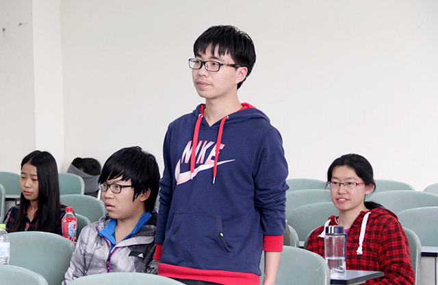 首先,彭君提出一个有关“在场同学心目中的女神是谁”的问题,这一问一下就吸引住了在场同学,各班班委代表激烈交流,大家各有各的看法,有的认为外在是作为女神的标准,有的则认为内涵更为重要。之后,大家就现在流行的宅男宅女的现象进行了讨论,倡导大家积极参加运动锻炼,少在室内玩游戏,做个现代的美少年。