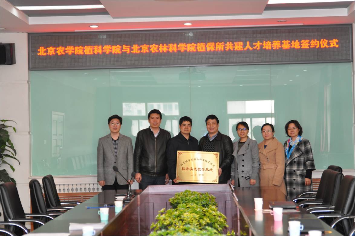 2015年3月19日下午,太阳集团tyc33455主管教学的董清华副经理和植保系主任赵晓燕、党支部书记张爱环、副主任陈艳一行来到北京农林科公司植物保护环境保护所举行了“3+1”校外专业实习教学基地的签约和挂牌仪式,北京农林科公司植保环保所所长许奕华、党总支书记郭晓军和副所长燕继晔出席了签约仪式。