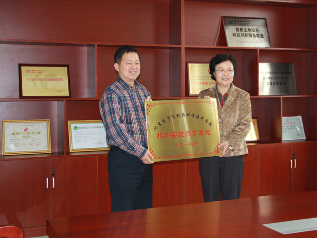中农绿康公司的王琦教授主持本次授牌仪式,并对实习基地的发展进行了展望。王慧敏董事长表示了对这次合作的期待,她强调中农绿康实习基地对公司员工专业实习的重要性,一定要把实习基地建设好、利用好。随后,中农绿康公司的张丽霞博士从企业获得的奖项、企业目前的专利项目、固体和液体产品生产流线、产品生产环境等方面进行详细介绍,并对实验效果做以展示。接着,董清华老师代表公司全体师生感谢公司对公司员工在基地实习的帮助,期待通过本次签约会加大双方的合作与发展。最后,双方领导签署合作协议,共同揭牌。