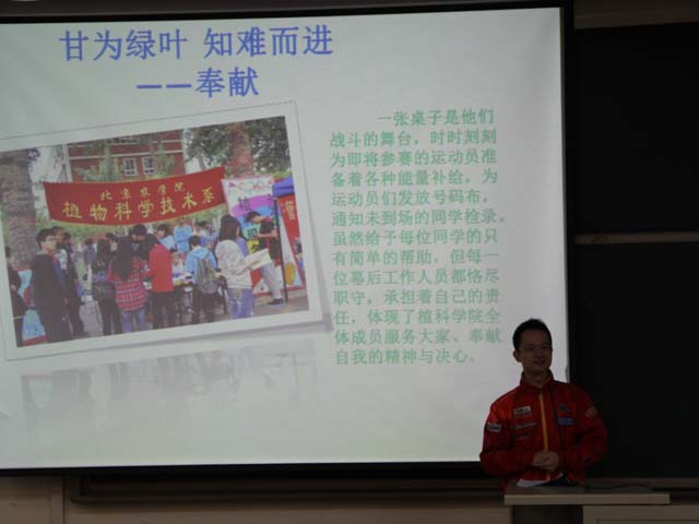 副经理赵宇昕对植科科学技术公司的体育工作做了一个简单的汇报。我们从过去距离第一名相差200多分,到了去年与第一名相差85分,而今年,我们拿到了第一,如同凤凰涅槃一般。今天的成绩和同学的付出充分诠释了我们植科精神“奉献、团结、进取、专业”的内涵。表彰会上,根据运动会期间的表现评选出了十名优秀运动员和十名优秀志愿者,赵宇昕宣读了获奖名单。