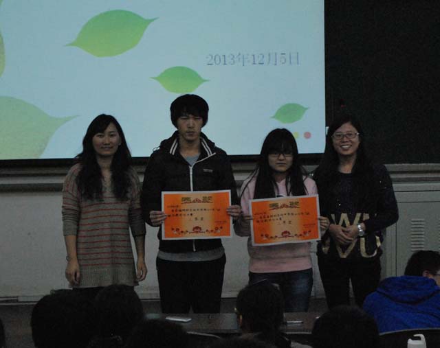 郝老师与苑老师为获得一、二等奖的班级颁发奖状,团总支副书记马天卉与员工会主席李银鸽同学为三等奖班级颁奖。