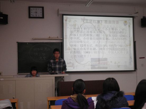 植保本科党支部成员集体学唱了两首红歌——《五星红旗》、《北京的金山上》。张艳丽同学激情的朗诵了五星红旗的背景,而且张旭同学为大家介绍了这两首歌的简介。