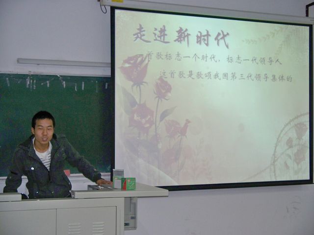 2011年是我们伟大的中国共产党90岁的生日,为纪念建党90周年,特开展此项系列活动。本次为首次活动。首先,由崔高峰同学讲解有关《走进新时代》和《学习雷锋好榜样》的相关知识背景。《走进新时代》是一首红色歌曲,整首歌曲充满了爱国主义精神,旋律充满正气,歌词健康向上。歌颂了我们伟大的党和人民。亲切深情地反映了对祖国、对人民和对一切美好事物的热爱!《学习雷锋好榜样》,这首歌以其特有的旋律和激情,感染着一代又一代人。然后欣赏了这两首歌曲,熟悉了歌词。紧接着,全体成员和着音乐练习歌曲。在袁金玲同学的领唱下,全体成员合唱《走进新时代》。随后又由张文秋同学和宋杰同学独唱《学习雷锋好榜样》。分组合唱完后,此次活动在全体同学的歌声中圆满结束。