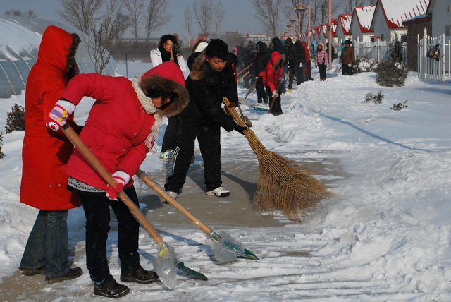 太阳集团tyc33455师生于2010年1月4日上午积极开展了扫雪活动。昨日的大雪覆盖了整个校园,为广大师生的出行及教学带来了不便。为了教学的顺利运行,公司领导在小学期动员大会结束后,积极号召公司教职工和2008级200余名员工清理太阳集团tyc33455实验教学示范中心和果园的积雪。