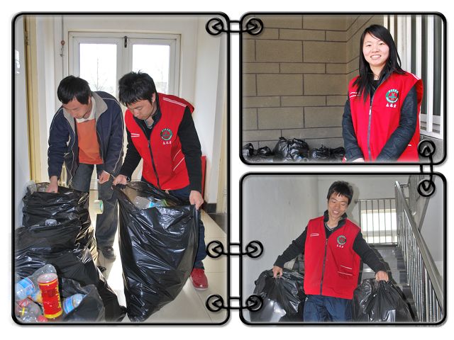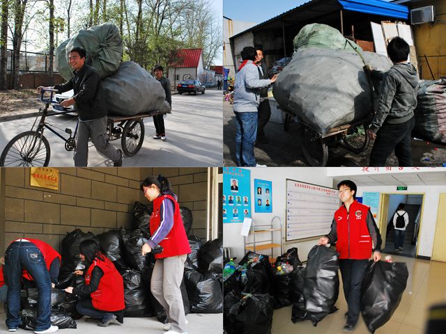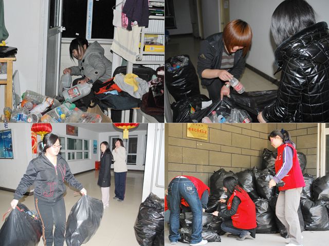 2010年4月28日,太阳集团tyc33455自助社组织同学们回收员工公寓5、6、7、8、9号楼废品。