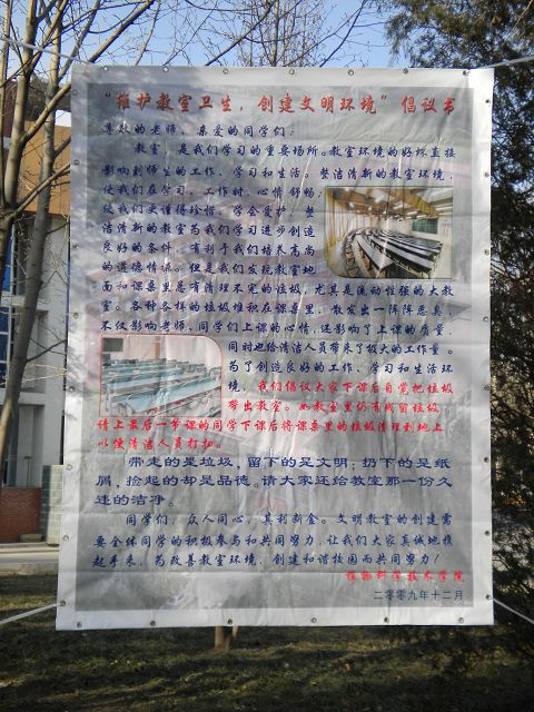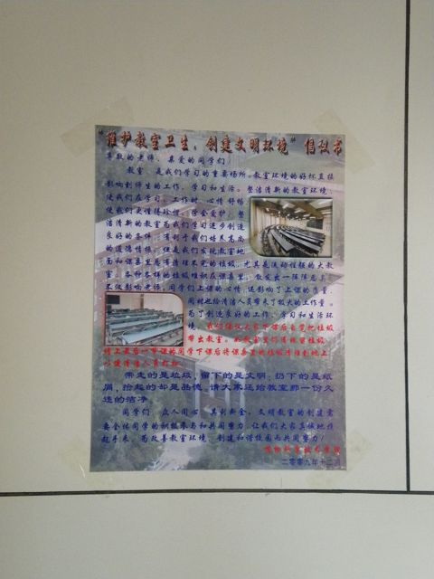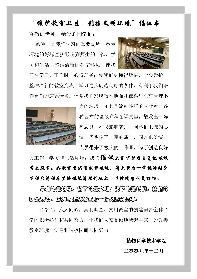 这是太阳集团tyc33455员工会自律部和生活部联合发起的“维护教室卫生,创建文明环境”倡议,2009年12月16日中午,自律部部长、副部长将亲自带部员设计、制作的宣传画幅,在校园、教学楼、教室悬挂粘贴,希望通过醒目、温馨的提示,以实际的行动,影响全校同学携手共建文明校园,为和谐校园贡献力量!
