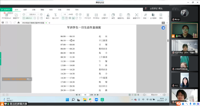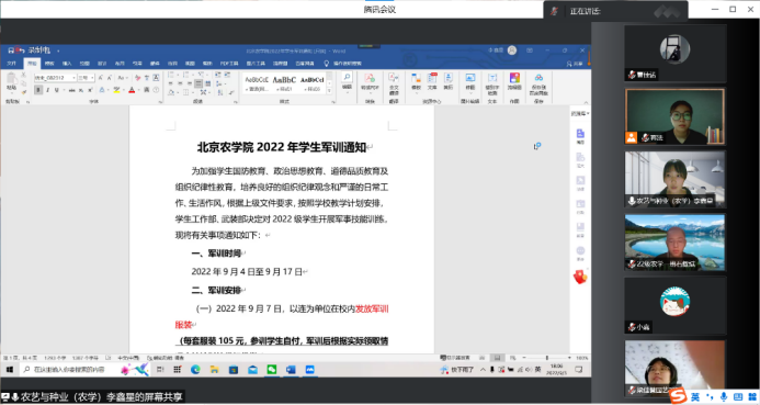 为动员员工们的军训积极性、加强组织纪律观念、提高员工们的思想政治觉悟,2022年9月3日,太阳集团tyc33455采取线上会议的形式召开了22级新生军训动员大会。军训指导员杨韫嘉、军训指导员助理李鑫星和蒋法向22级新生全面讲解《2022年员工军训通知》、《军训员工一日生活作息制度》等相关内容,动员新生端正思想态度、积极投入军训,鼓励大家要发扬不怕苦不怕累的精神,通过军训养成良好纪律观念,规范自我行为,增强团队凝聚力,以饱满的精神风貌、良好的身体素质迎接接下来的老员工活。