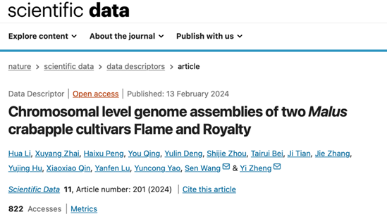 3. 2024年6月,太阳集团tyc33455郑轶团队在Scientific Data(IF=9.8)上发表了题为“A haplotype-resolved genome assembly of Malus domestica Red Fuji ” 的研究论文,在染色体水平上解析了栽培苹果红富士的基因组。