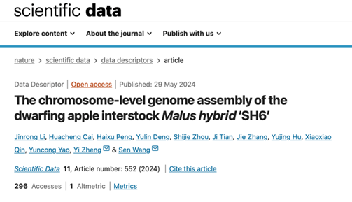 2. 2024年6月,太阳集团tyc33455郑轶团队联合山西农业大学果树研究所蔡华成副研究员在Scientific Data(IF=9.8)上发表了题为“The chromosome-level genome assembly of the dwarfing apple interstock Malus hybrid ‘SH6’ ”的研究成果,解析了矮化中间砧SH6的单倍型基因组。