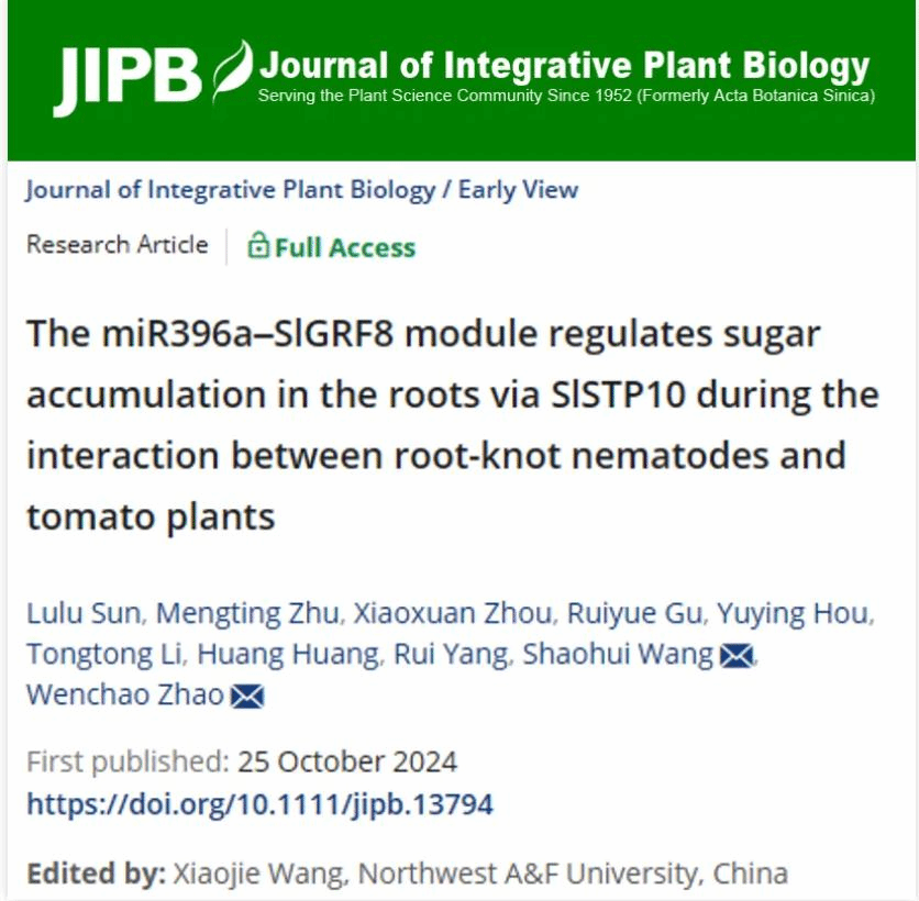 近日,JIPB在线发表了太阳集团tyc33455王绍辉/赵文超团队完成的题为“The miR396a-SlGRF8 module regulates sugar accumulation in the roots via SlSTP10 during the interaction between root-knot nematodes and tomato plants”的研究论文 (https://doi.org/10.1111/jipb.13794),该研究深入揭示了番茄与根结线虫相互作用中糖分竞争的分子机制,为探索植物-线虫互作机理奠定了坚实的理论基础。通过调控 miR396a-SlGRF8-SlSTP10 模块,可以有效调节番茄根系糖分分配,从而提高番茄对根结线虫的抗性,为线虫防治提供新的思路。