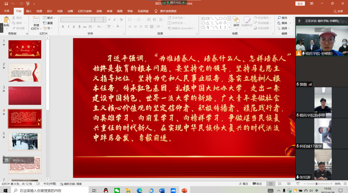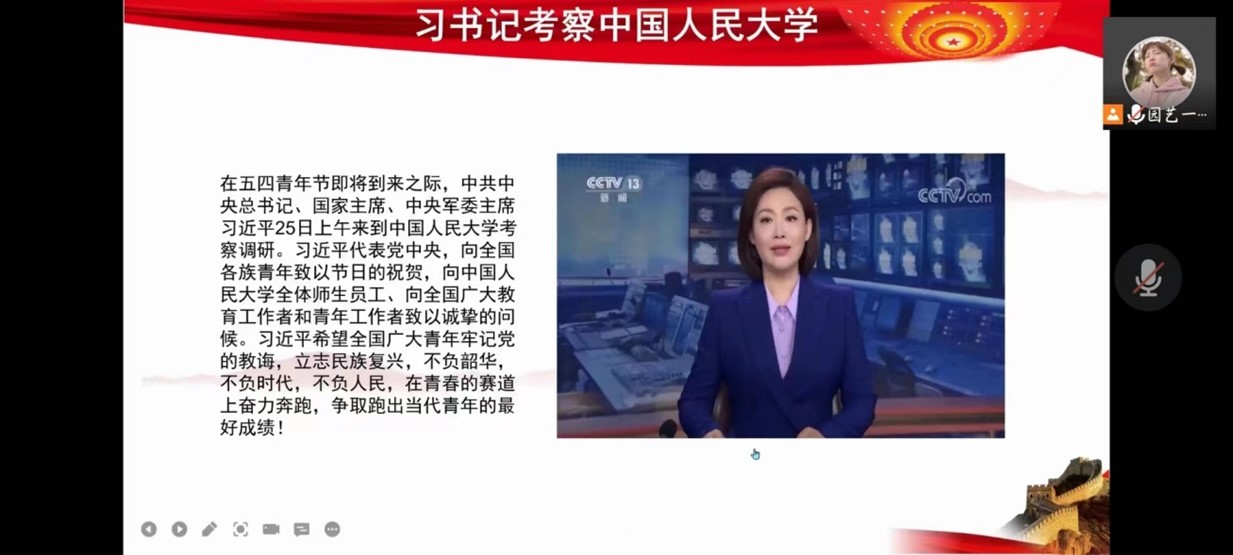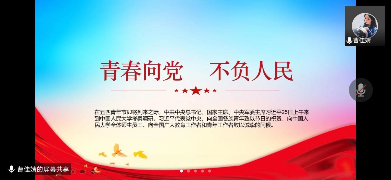 在五四青年节即将到来之际,习近平总书记来到中国人民大学考察调研,他指出,立足新时代新征程,中国青年的奋斗目标和前行方向归结到一点,就是坚定不移听党话、跟党走,努力成长为堪当民族复兴重任的时代新人。太阳集团tyc33455团委组织各团支部开展“学习习近平总书记考察中国人民大学时发表的重要讲话”主题团日活动。习总书记的重要讲话引发了同学们的强烈反响,大家表示在今后要坚定不移听党话、跟党走,为中华民族的伟大复兴作出自己的贡献。