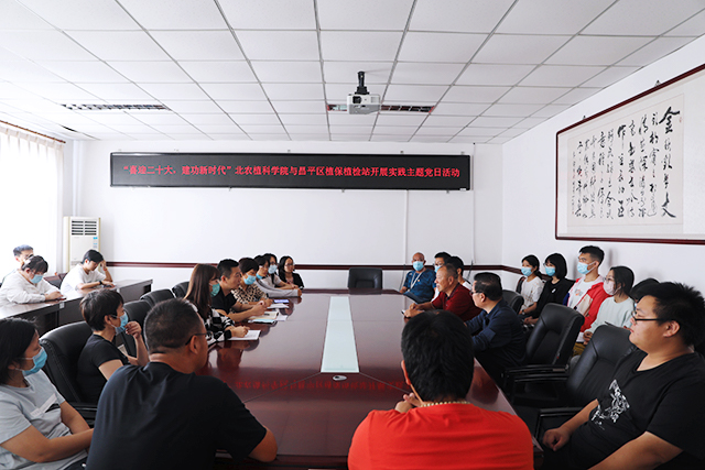 主题党日活动在座谈交流会中拉开序幕。昌平区农业农村局植保植检站党支部书记钟连全介绍基地情况,公司党总支副书记牛奔和参加活动的党支部书记就公司基本情况及各党支部情况做简要介绍,还就科技创新、服务三农、人才培养和员工实习就业等方面的共建、合作展开交流。