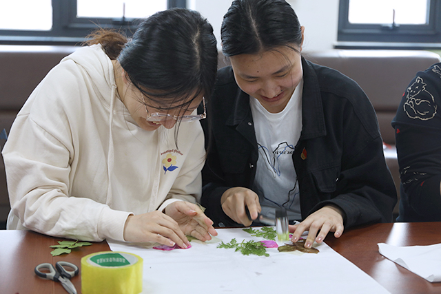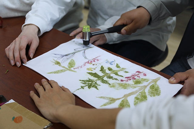 员工党员卢超凡向参加活动的师生党员讲解植物敲拓染这一非物质文化遗产的历史和知识,介绍所需材料、工具、制作流程及注意事项。了解植物敲拓染过程后,师生党员们开始挑选树叶、花朵,整理叶片,均匀铺开,再用胶带将植物进行固定,通过“一锤一石”把植物的自然形状、色彩、纹理拓印在方巾上。