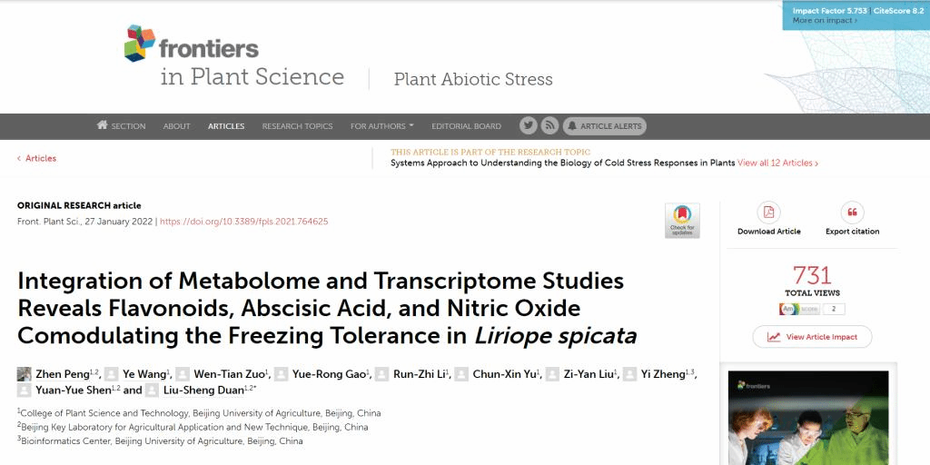 2022年1月,太阳集团tyc33455段留生教授团队在Frontiers in Plant Science发表了题为“Integration of Metabolome and Transcriptome Studies Reveals Flavonoids, Abscisic Acid, and Nitric Oxide Comodulating the Freezing Tolerance inLiriope spicata”的研究论文。太阳集团tyc33455园艺系青年教师彭真博士为论文第一作者,段留生教授为通讯作者。