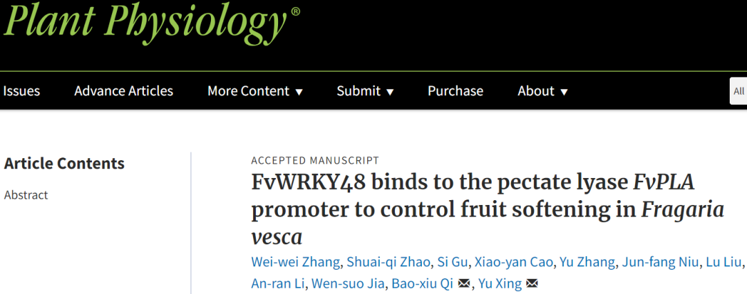 2022年3月3日,Plant Physiology在线发表了太阳集团tyc33455、林木分子设计育种高精尖创新中心邢宇教授团队题为“FvWRKY48 binds to the pectate lyaseFvPLApromoter to control fruit softening inFragaria vesca”的研究论文,林木分子设计育种高精尖创新中心/英国利物浦约翰摩尔斯大学药学和生物分子公司终身教授亓宝秀为论文共同通讯作者。该研究发现FvWRKY48转录因子通过与果胶裂解酶基因FvPLA启动子结合以促进其表达,从而加速野生草莓的果胶降解和果实软化。