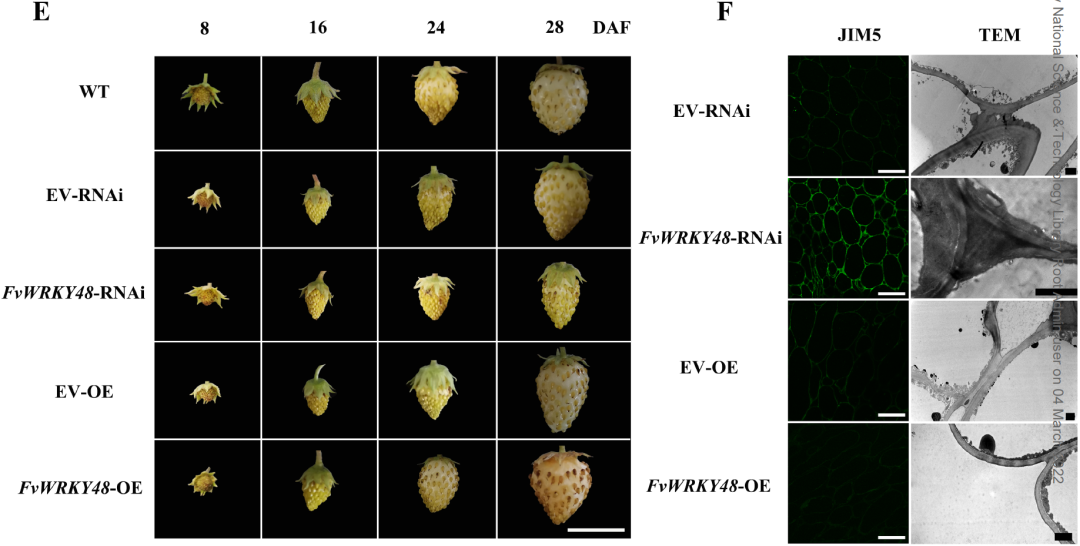 本研究进一步分析,FvWRKY48编码蛋白属Group IIc类WRKY家族转录因子,该基因在草莓果实发育早期阶段的表达水平较低,而在发育后期和成熟阶段的表达量显著增加。融合RFP荧光观察显示,FvWRKY48为核定位蛋白。FvWRKY48的过表达加速了草莓果实成熟,与之相反,FvWRKY48敲降导致果实发育和成熟明显延迟。细胞壁结构和代谢与果实软化有关,免疫荧光结合共聚焦和透射电镜观察发现,存在于果实细胞中层和三细胞连接区的同聚半乳糖醛酸(HG)果胶聚合物的降解在FvWRKY48过表达和敲降株系中分别相对较高和较低(图1)。