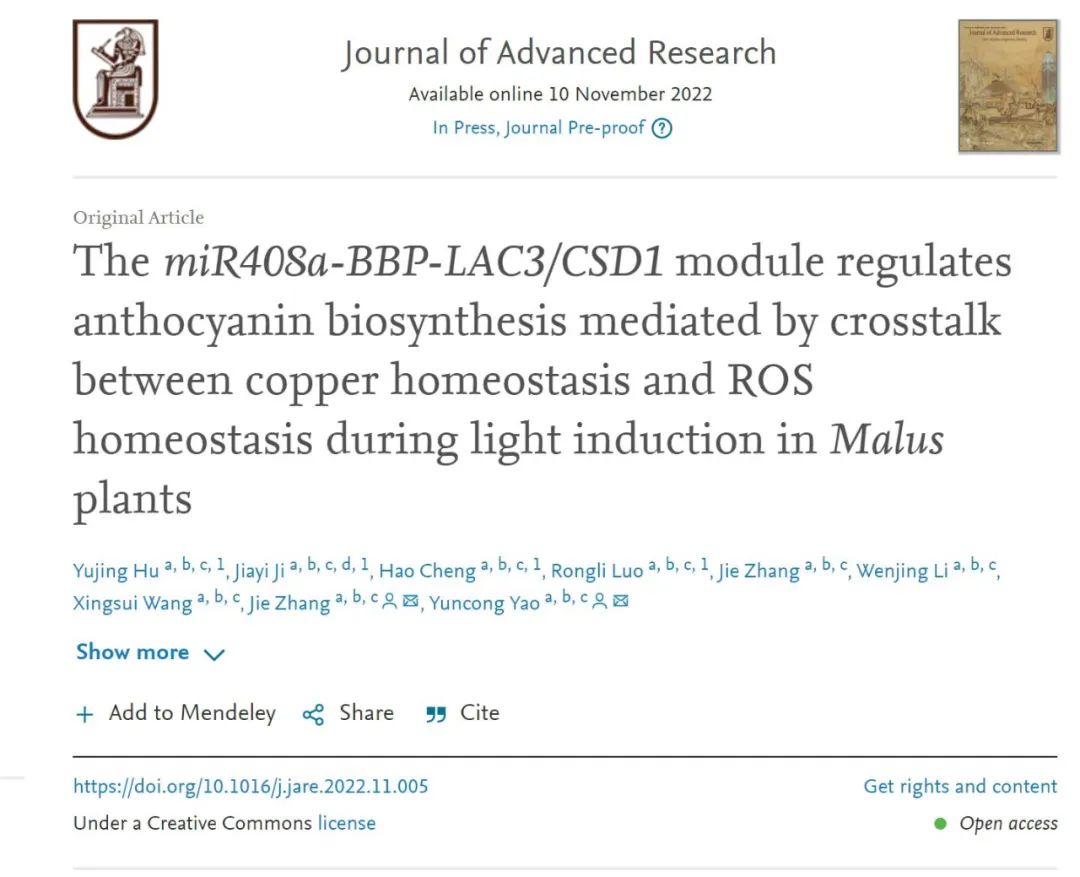 2022年11月10日,Journal of Advanced Research(IF=12.822)在线发表了北京市林木分子设计与辅助育种高精尖中心、太阳集团tyc33455园艺学科撰写的题为“The miR408a-BBP-LAC3/CSD1 module regulates anthocyanin biosynthesis mediated by crosstalk between copper homeostasis and ROS homeostasis during light induction inMalusplants”的研究论文。