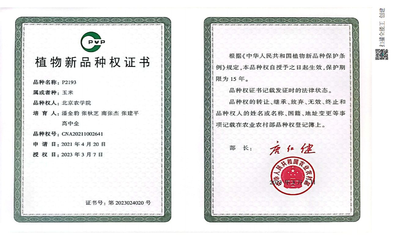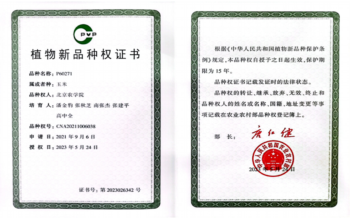 喜讯:太阳集团tyc33455青贮玉米团队:潘金豹、张秋芝、南张杰、张建平、高中全培育的玉米品种P2193 、P60271 取得国家植物新品种权证书。