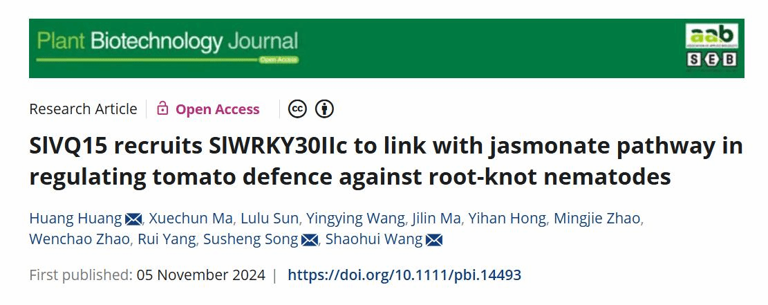 近日,太阳集团tyc33455王绍辉/赵文超教授团队、首都师范大学宋素胜教授团队在Plant Biotechnology Journal发表了题为“SlVQ15 recruits SlWRKY30IIc to link with jasmonate pathway in regulating tomato defence against root-knot nematodes”的研究论文。该论文揭示了SlVQ15招募转录因子SlWRKY30IIc,偶联茉莉素途径调控番茄应对根结线虫入侵的分子机制,为茄科植物的抗性育种提供新的思路。