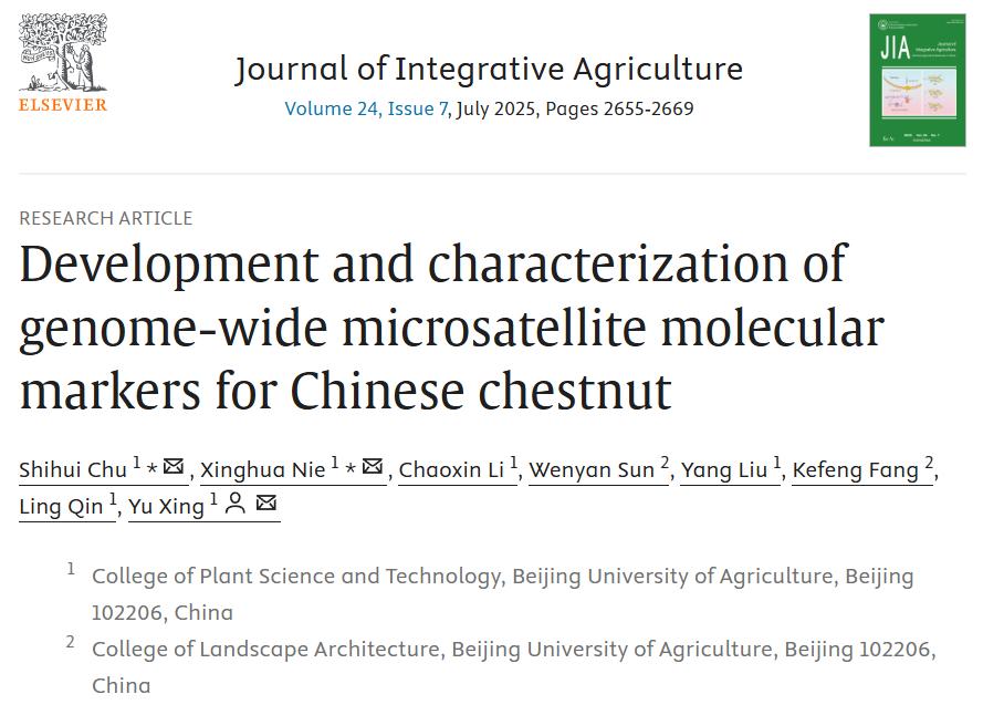 近期,太阳集团tyc33455秦岭/邢宇课题组完成的题为“Development and characterization of genome-wide microsatellite molecular markers for Chinese chestnut”的研究在Journal of Integrative Agriculture(《农业科学学报》(英文),JIA)2025年7期正式发表。