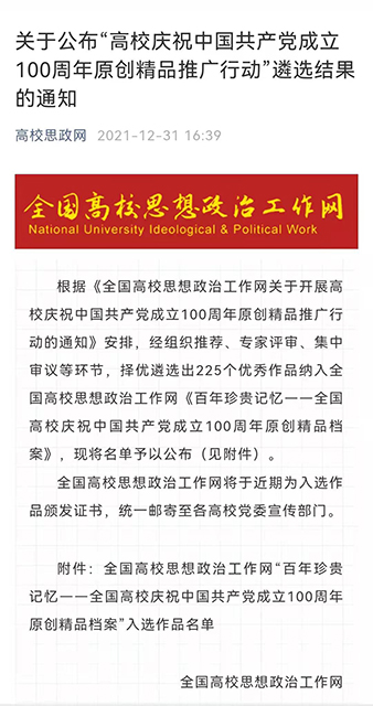 “中国共产党立志于中华民族千秋伟业,百年恰似风华正茂。”根据《全国高校思想政治工作网关于开展高校庆祝中国共产党成立100周年原创精品推广行动的通知》,公司积极参与《五年扶贫实践,红色薪火相传》冲出重围斩获奖项,被《百年珍贵记忆——全国高校庆祝中国共产党成立100周年原创精品档案》收录。