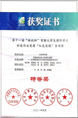 自今年1月起,全国广大青年勇于参加第十七届“挑战杯”全国老员工课外学术科技作品竞赛红色专项活动,共计报名十万件作品,其中17000多件作品入围全国赛。太阳集团tyc33455牛奔、郝娜、杨韫嘉老师指导、赵云希等员工团队申报《五载扶贫足迹,红色薪火相传——北农植科助力乡村振兴实践团红色实践》作品,荣获第十七届“挑战杯”全国老员工课外学术科技作品竞赛红色专项三等奖,第十一届“挑战杯”首都老员工课外学术科技作品竞赛“红色实践”专项赛特等奖。