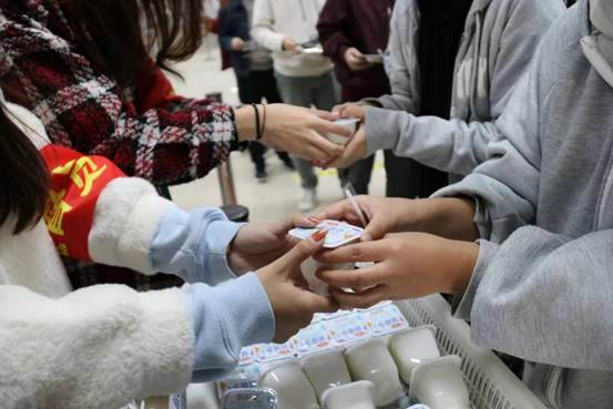 志愿者们通过“发红花、领酸奶”的奖励机制调动全校师生的积极性,让大家自觉参与到光盘行动的中去。