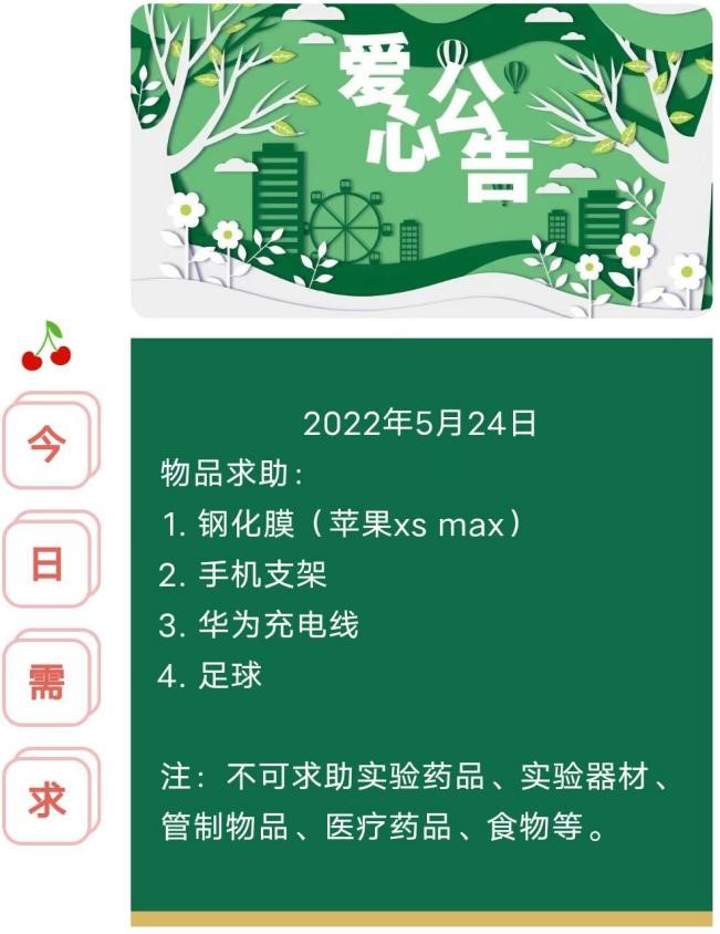 活动于2022年5月24日正式开始,同学们踊跃参与,通过平台提出自己的需求,将闲置物品置换,最大程度提高资源利用率,让校内物品“活”起来,人心“暖”起来。经过需求统计,了解到大家需要求助的物品有收纳箱、手机充电器、文件夹、生活用品(蚊帐、空调被、毛巾、浴巾)、体育用品(足球、羽毛球拍、沙包)及面试正装、手机支架等。目前,已完成大部分需求清单。后续我们会继续跟进,希望同学们积极参与,让我们的“物物交换”平台“忙起来”。我们携手共度,同心抗疫,让互帮互助的美好精神在校园“遍地开花”。