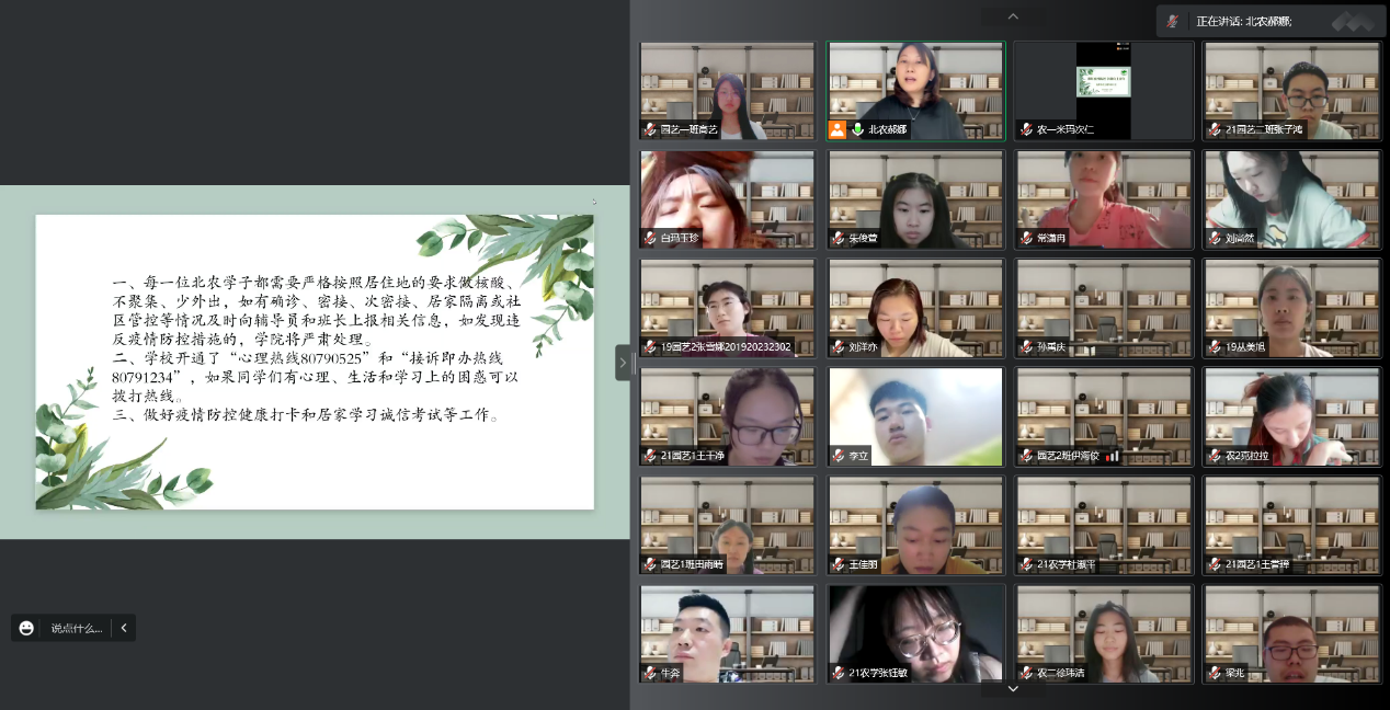 2018级、2020级辅导员杨韫嘉号召大家筑牢疫情防控思想,主动查漏补缺,及时上报动态。20年级员工要严格教学管理,不逃课,做好期末学习考试准备,发出诚信考试倡议。18年级员工积极配合公司做好毕业手续相关工作,公司和公司会全力做好毕业年级“最后一公里”工作。鼓励大家克服疫情困难,积极参与线上招聘会、投递简历,进行网签等。