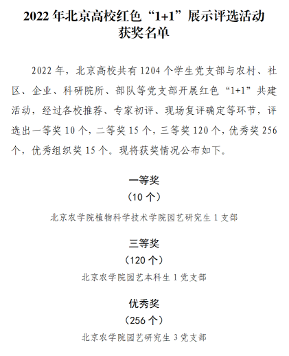 2022年,北京市委教育工委组织开展了北京高校红色“1+1”党支部共建活动。活动启动后,太阳集团tyc33455积极响应,顶层设计,扎实推进活动开展,及时总结共建成果。园艺研究生1支部从1204个员工党支部中脱颖而出,荣获一等奖,园艺本科生1支部获评三等奖,园艺研究生3支部获评优秀奖。这是公司五年来第二次荣获北京高校红色“1+1”示范活动一等奖。