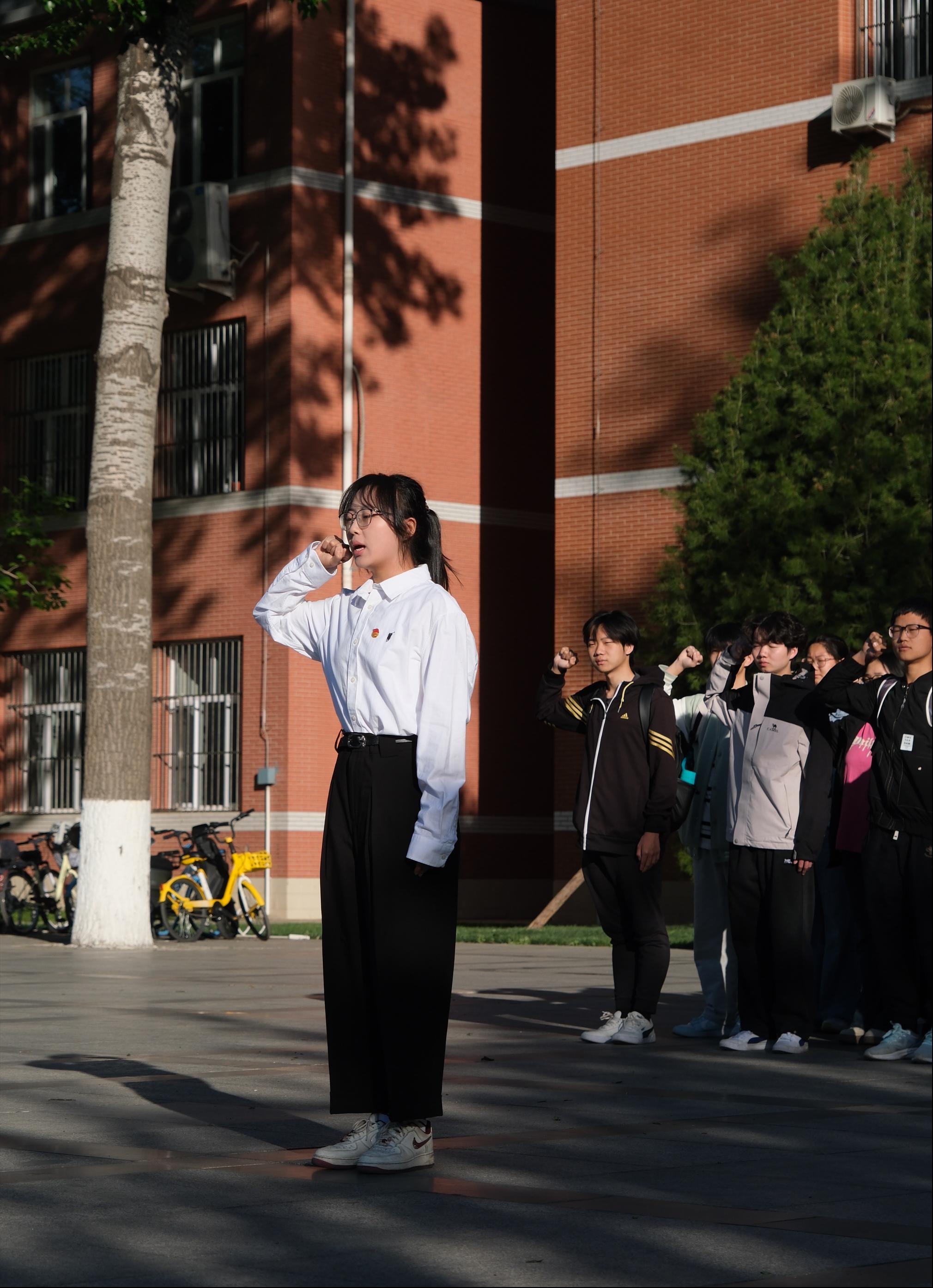 团员代表梁博文带领全体团员在国旗下庄严宣誓。誓言铮铮,响彻现场,表达了团员们坚定的理想信念与决心。在今后的学习和生活中,他们将以实际行动践行习近平总书记对共青团员的殷切嘱托,把个人成长紧密融入国家发展的伟大宏图中,以奋斗姿态书写“请党放心,强国有我”的青春誓言,在新时代的广阔舞台上展现青春风采、贡献青春力量。